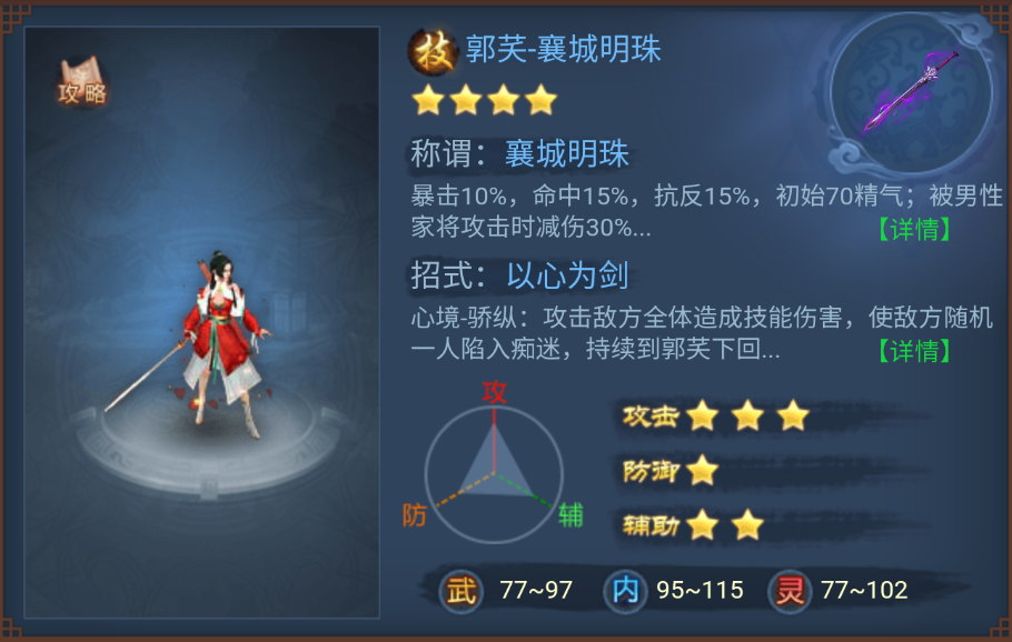 郭芺归属为技能将,初始暴击较高,自带减伤,招式根据当前心境变换,除造成伤害外还可治疗队友,应优先最求内力获得更高的技能伤害,核心装备是:书籍