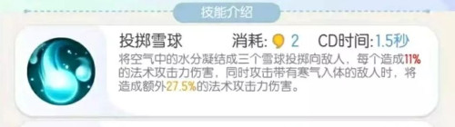 消耗的能量和CD都一般,1.5秒的冷却时间这代表只要有足够的能量,虚日鼠可以一直攻击下去。她会捏三个雪球砸向敌人,每个雪球造成少量的法术伤害,同时攻击带有寒气入体的敌人时,将会额外造成27.5%的法术伤害。寒气入体效果需要使用二技能才能打出来。
