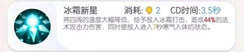 技能冰霜新星(觉醒之前为召唤雪人),给予敌人冰霜打击,造成48%(满级72%)的法术攻击力伤害,同时使敌人进入寒气入体的状态。