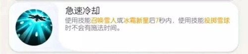 被动技能急速冷却,使用2技能召唤雪人/冰霜新星后4秒(满级8秒)内,使用1技能投掷雪球/雪球飞舞时不会有施法时间。